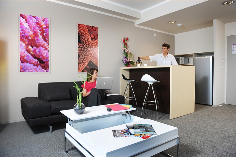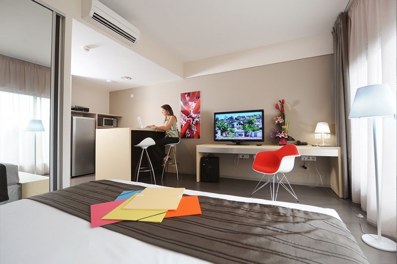 Located in the heart of the business district, our hotel offers 59 fully equipped studios and lofts, 2 restaurants, 10 seminar rooms and 1 fitness room. Parking and high speed secure WiFi (250 MB / day) are included.